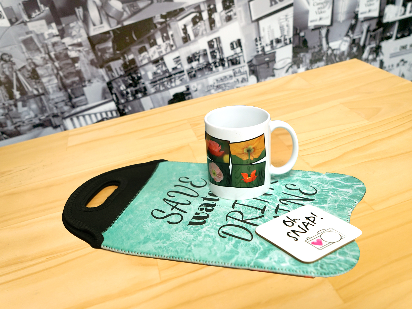 Order in-store, at home, or via your mobile device. Photos are printed and pressed onto specially coated gifts in our store using a dye sublimation process. We print Monday to Friday and prefer 48 hours to complete an order but can rush for an urgent fee.